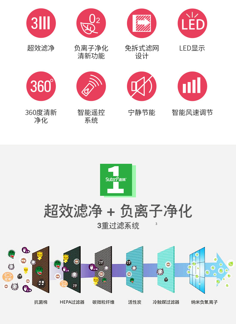3重过滤系统:过滤毛发、烟雾、花粉、粉尘达到3.0微米,多重复合过滤增强了吸附,分解异味、酸味、酒味、霉味、甲醛、苯、TVOC、霉菌、病菌、病毒等有害物和有害气体,杀菌率达到99.9%